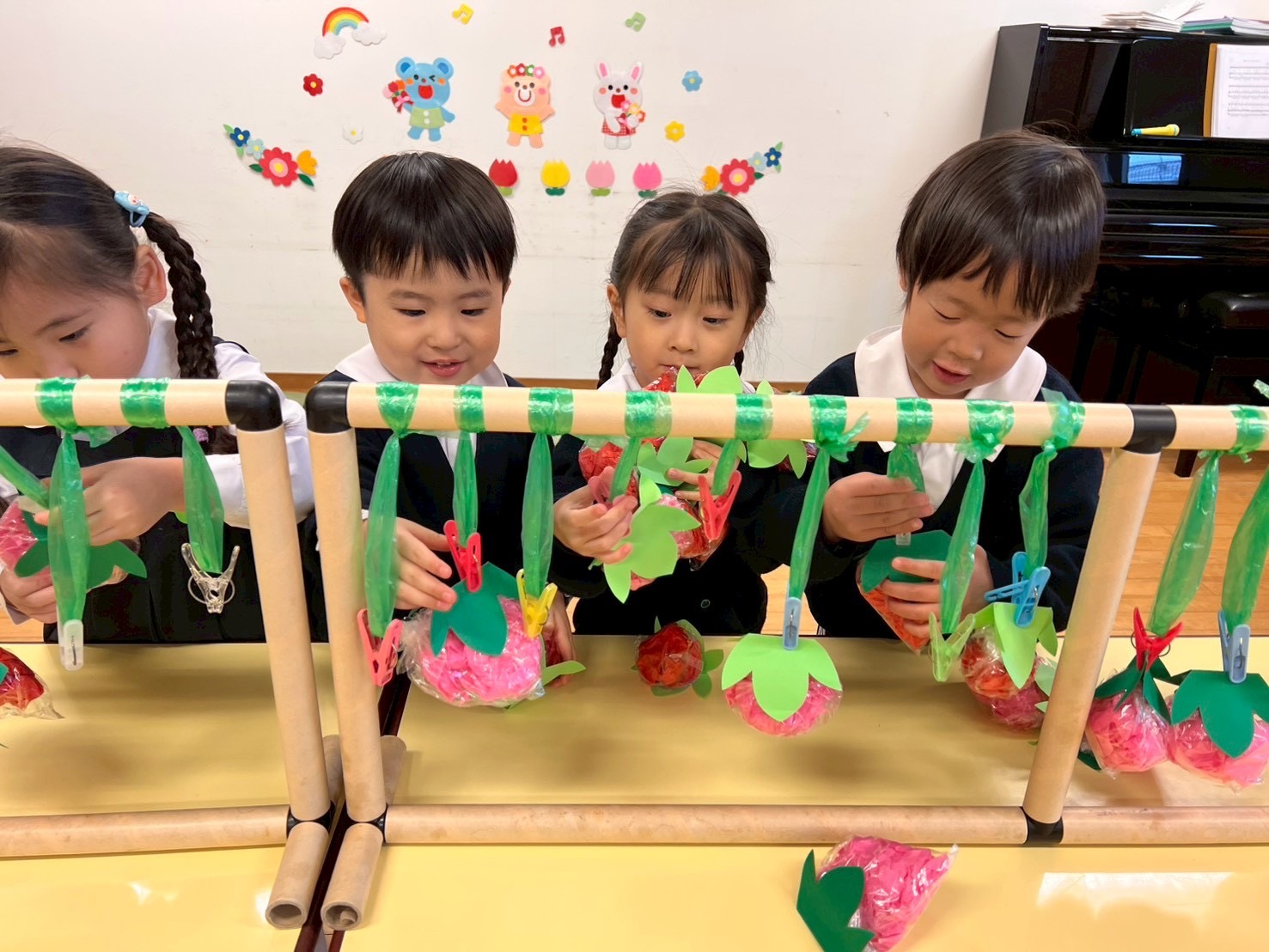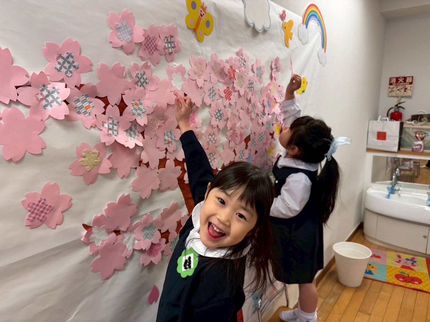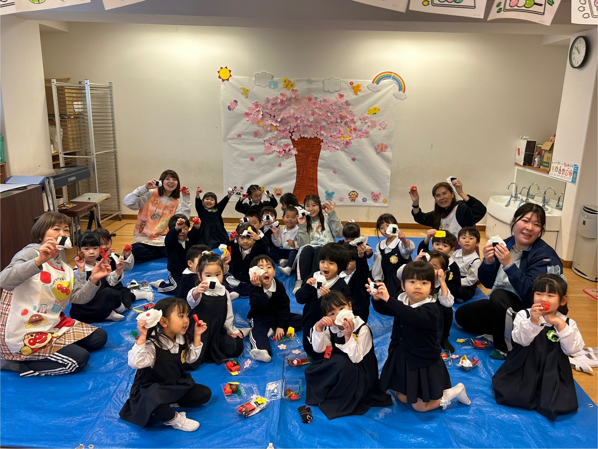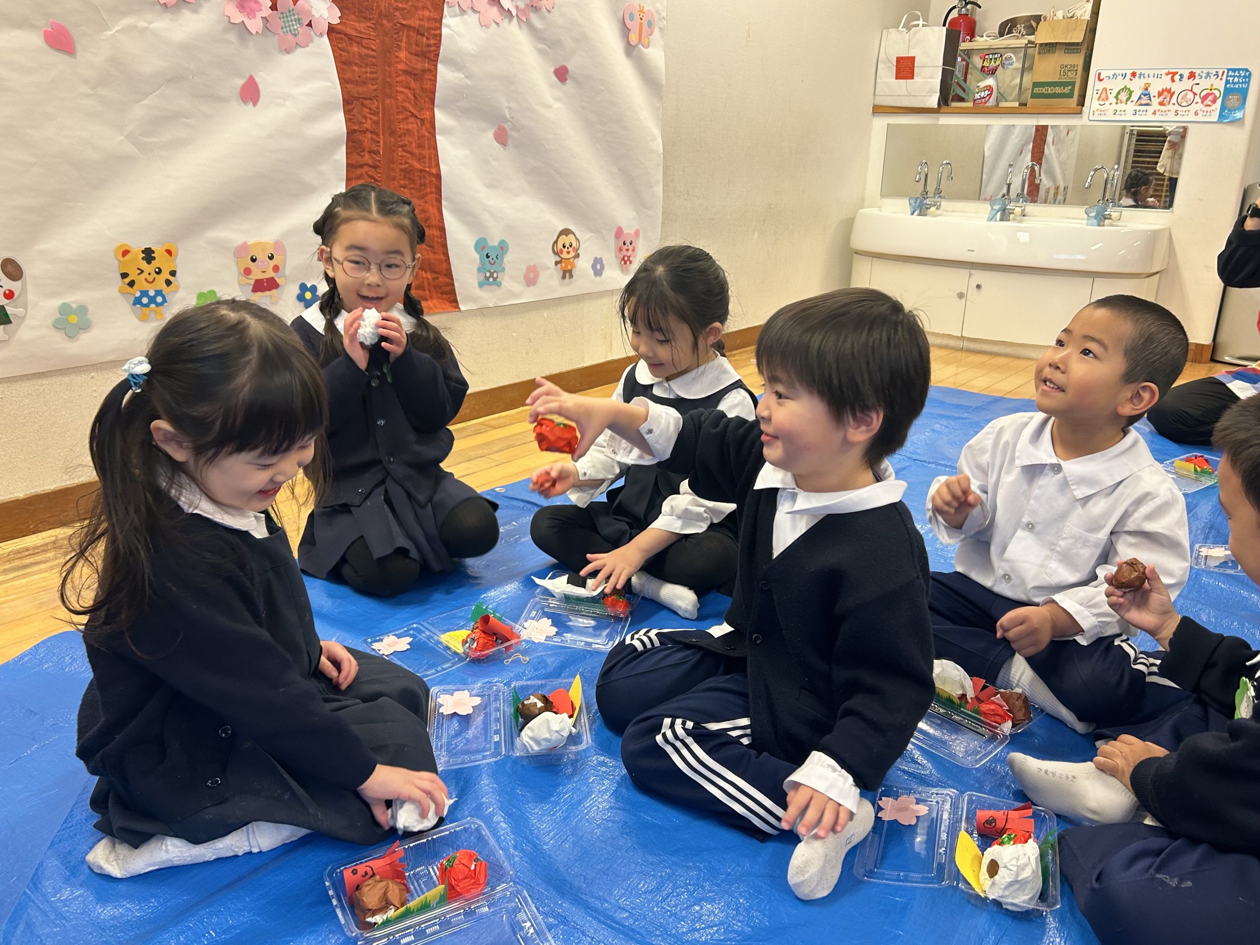 年少組お楽しみ会 2026 3/13 お知らせ 壁に貼った桜の木にも徐々に花が咲き、今日ついに満開になりました🌸年少さんみんなでお弁当を作ってお花見ごっこをしました🎵初めての幼稚園、お友だちとみんなで仲良く楽しい思い出がたくさんできました💛年中さんになってもいっぱい遊ぼうね💕 お知らせ 年中組クッキング🍰 年長組お楽しみ会